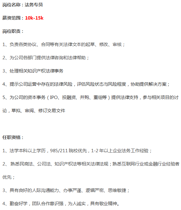 准上市的金融科技公司招法务专员,10-15K,9-6工作时间,中午休息1个半小时,每天下午茶畅饮,交通便利9号商城路2号东昌路,老佛爷楼上
