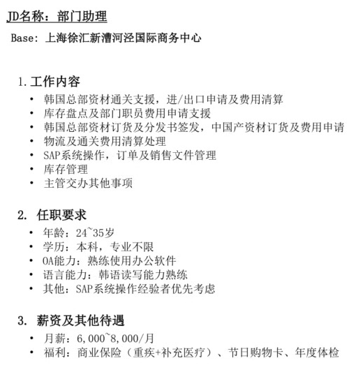 韩资企业要个部门助理,男士优先,1~4年工作经验,要是条件很好的话薪资可谈
