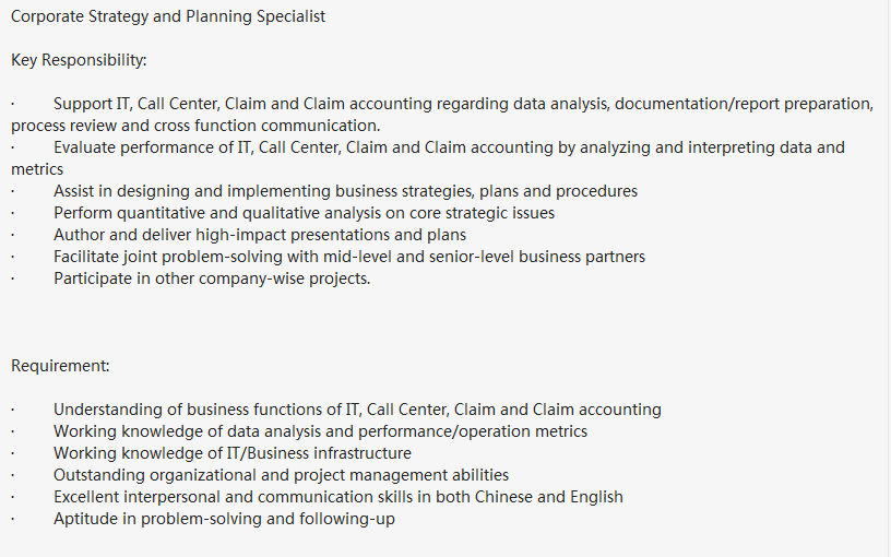 法资企业要个战略部助理,jd如下