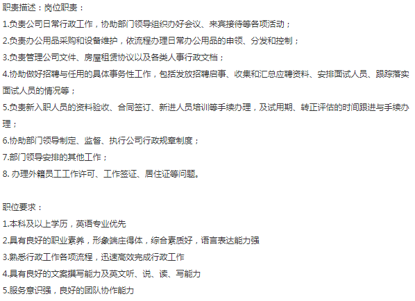 外资贸易公司招聘行政前台,薪资7-10K,最好是本科学历,英语口语可以日常沟通,五险一金+带薪年假,上班地点:黄浦区2号线南京东路