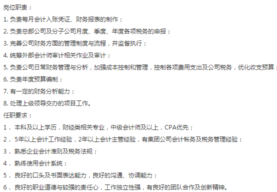 要求:本科及以上学历,有中级职称,5年以上会计工作经验,2年以上会计主管经验,集团公司会计帐务及税务管理经验,有IPO优先考虑,基本薪资:10-20k,五险一金全额,朝九晚六,双休,年底bouns,地址:近8&10号线四平路