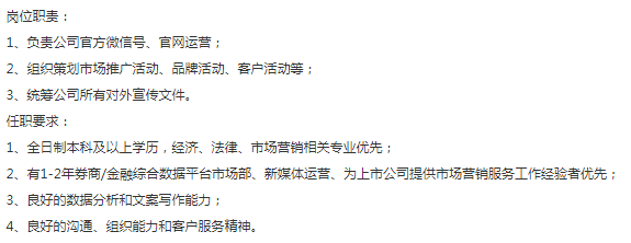 知名咨询公司招市场专员,要求全本学历,女生优先,最好是金融券商,咨询公司或者财经媒体出来的,有1-2年相关工作经验,10-15k+年终奖,至少是13薪,五险一金全额,补充商业医疗保险,6天年假,5天的带薪病假,4号线浦电路上班