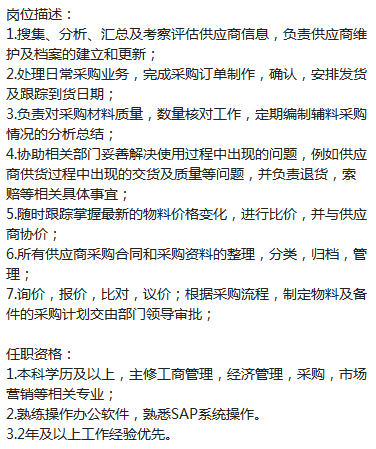 知名外资贸易公司,要个采购专员,薪资7-10K,2年左右经验,制造业背景优先,会SAP系统的优先,位置9号线合川路。