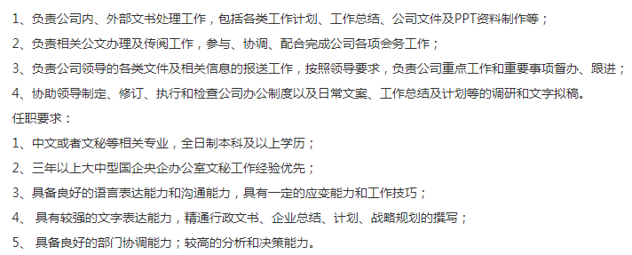 知名金融科技公司,招高级文秘,发展方向为董事会秘书,文笔好,汉语言文学,新闻等专业优先,会速记优先,有3年以上文秘相关工作经验,薪资10-15k+全额交金+年底2-3个月年终奖,上班地点:2号线张江高科,JD如下