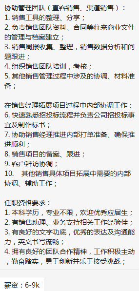 业内知名互联网公司要销售助理啦,急招岗位欢迎踊跃报名,要求全本以上学历,有相关经验佳,优秀应届生也可接受,薪资base6-9k,年底13薪保底,朝十晚七周末双休,坐标9号线漕河泾开发区。