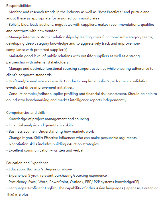 初级的薪资7-9k,中级的间接采购9-12k 擅长sourcing的。补充商业险,13薪+bonus