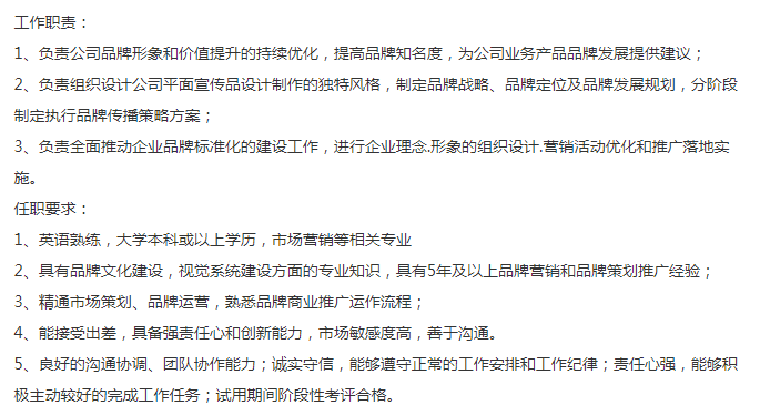 市场品牌营销5年以上工作经验 接受出差的那种。