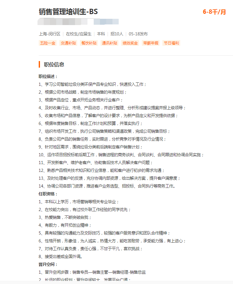 国资背景旗下环保公司要销售管培生,19-20年毕业的全日制本科学历,喜欢做销售的来报名。薪资6-8k+奖金。2号线虹桥火车站附近上班。形象要好点,对接政府部门比较多