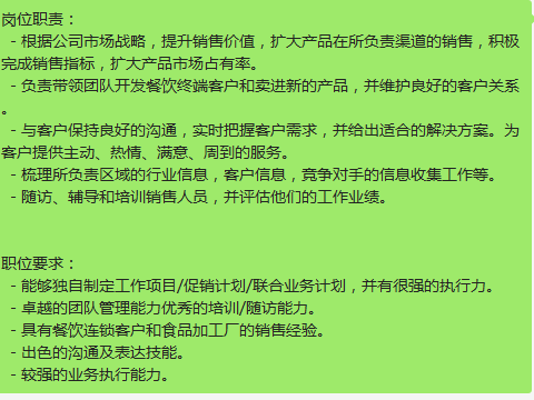 500强外资食品公司需要一名【销售主管】-【餐饮终端主管】要求一定要有做过餐饮终端的经验、并且有带过团队 团队目前手下5-6个人在岗 【此岗位急招】基本薪资 8-10(不含任何补贴和绩效 若包含这些月薪在12-15k之间) 五险一金全额缴纳 餐补12元/工作日 补充商业险 年底13薪+bouns 上班时间8-5 双休 地址:7号线行知路&一号线汶水路