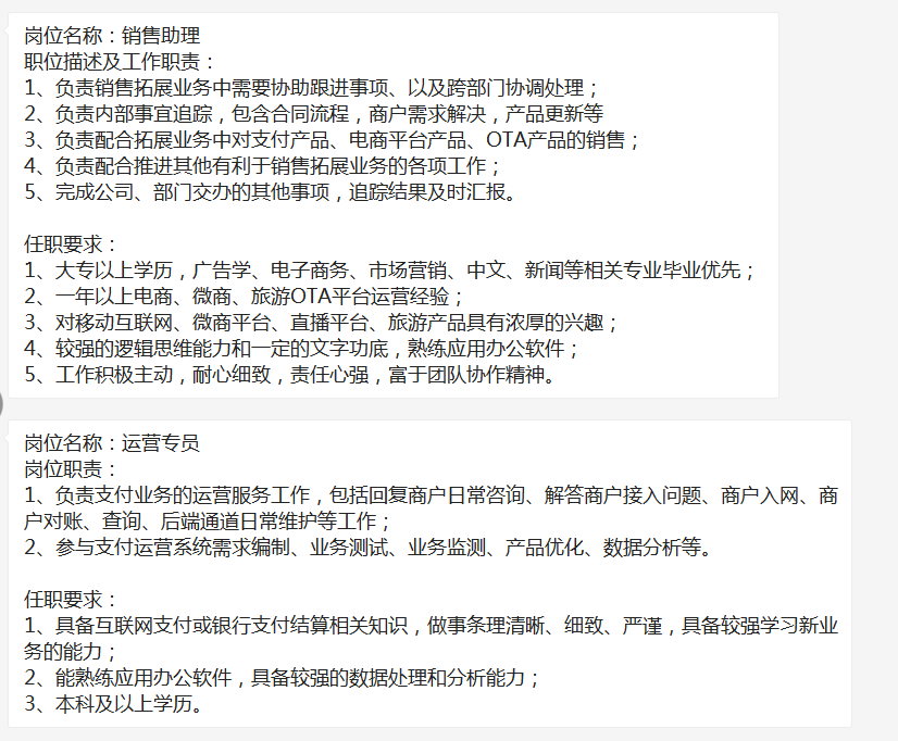 港资上市公司出来两个岗位,一个销售助理,一个运营专员,薪资都是7-9k,浦东浦电路附近上班,公司在做第三方支付业务的。急招岗