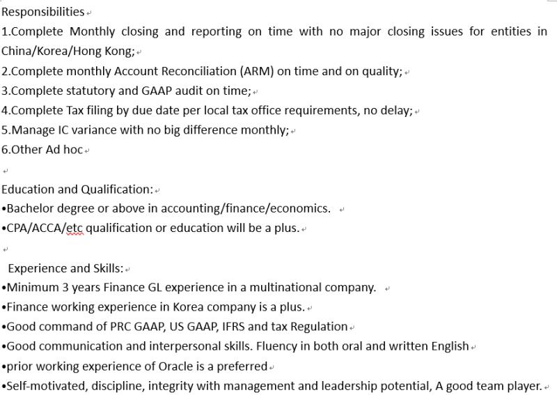 备注【英文好,最好有大型企业工作背景,3年以上财务工作经验,最好做过总账】