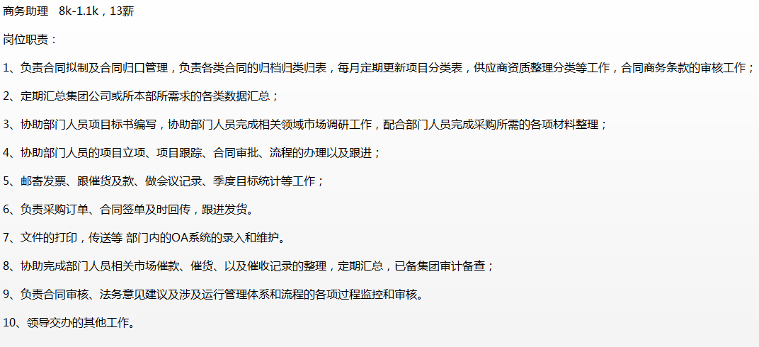 军工央企,要商务助理,985/211全日制本科及以上学历,具备法学、理工、管理类专业背景,软件行业从业背景者优先,薪资8-11k左右,福利优厚,灵活工作制;,2号线广兰路