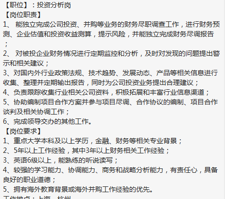 中国500强上市公司需要一名【投资分析师】 有产业投资经验最好 或者有PE/VC经验也可以 主要看专业能力 主要是公司的自有资金投资项目 希望候选人有CPA(非硬性) 擅长财务分析 财务建模 5年或以上相关工作经验 要硕士学历 不要跳槽频繁 具体看人谈年薪 (不限定薪资区间) 五险一金全额 统一补贴都有 地址 :近松江大学城