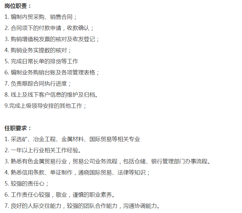 大宗行业龙头企业之一,公司总资产80亿左右,需要一个合同执行:最好有相关合同管理经验,或19-20届应届生,最好男生,本科,应届生6k左右,全额交金,饭补,年底0-6个月bonus等,4号线杨树浦路