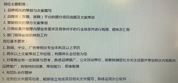 500强中华区总部招文案,做过记者加分项。薪资区间7-12k外加各类福利补贴,上班时间朝九晚六周末双休,坐标7号线岚皋路