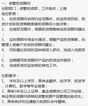 知名证券公司 上海陆家嘴上班 急招资管部投资顾问 证券公司、基金或期货公司等做投资交易资管相关的 全本及以上学历 硕士优先 年薪open 估计1-2万月薪 至少2年工作经验 男生优先