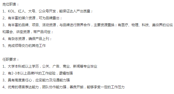合资互联网消费品公司要市场PR(美妆类),男女不限,要求有2-3年左右相关经验,全本学历,薪资7-10k,五险一金全额,车贴450左右,年终年末两次奖金1-6个月,朝九晚六,双休,上班地点:2号线广兰路