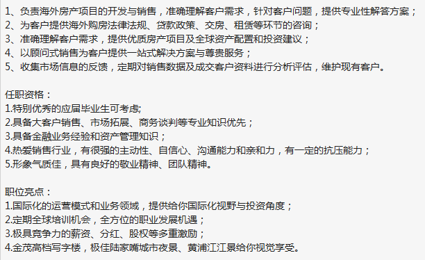 知名贵金属实业集团,国企改制背景旗下海外置业板块,招海外置业销售,无责任底薪6k-8k+绩效+奖金。年薪30-50万。年龄30岁以下,有行业经验优先,没有的2019年或者2020年工作经验者也可,上班地点:陆家嘴金茂大厦