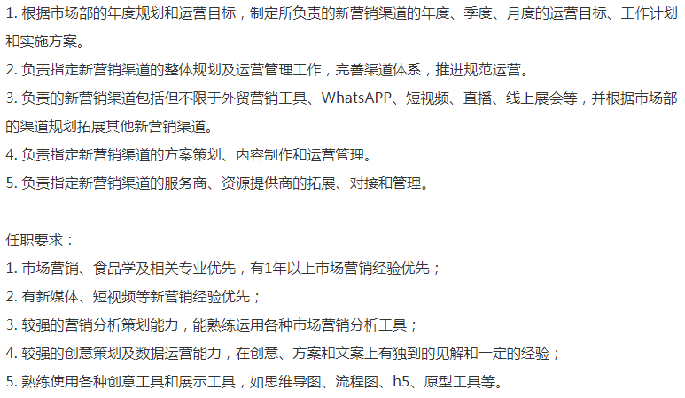 知名化工企业要【新媒体运营】,要求一年以上海外营销推广工作经验,熟悉海外的营销渠道,有较强的文案能力及策划能力,英语读写流利。薪资10-15k,年底1-3个月bonus,六险一金。坐标2号线广兰路