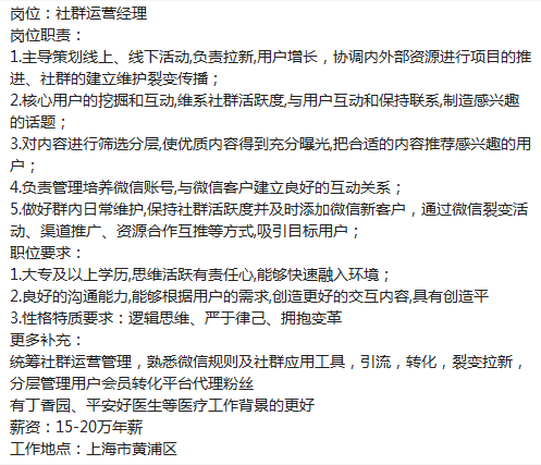 复星系需要一名【社群运营经理】,年薪15-20万,五险一金全额,补充公积金,年底1-2个月bouns,地址:近9号线小南门,jd要求如下: