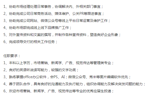 国企招一名市场助理,女生、全本学历,会PS、AI;有一定文字功底,薪资6-8k+补贴+全额交金+年终奖励,上班地点:2号线陆家嘴,jd如下: