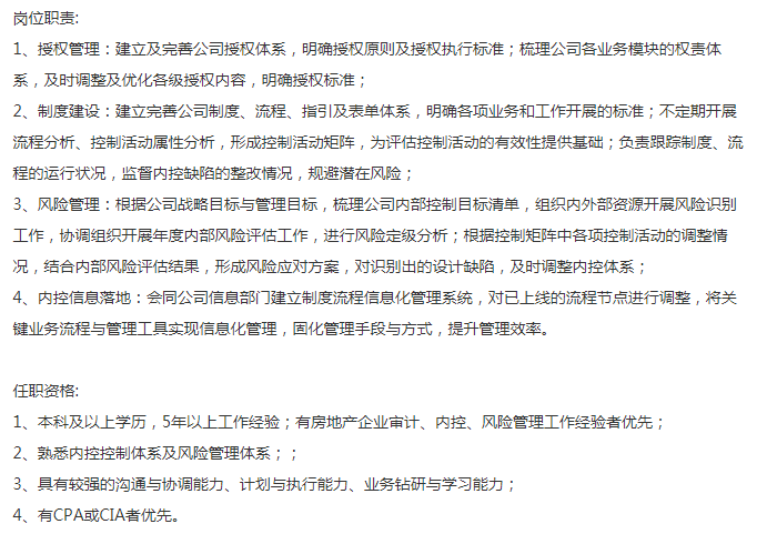 备注【27-33岁,统招本科及以上学历,审计相关专业;有地产行业的5年及以上的内控、审计经验,或者事务所有房地产项目经历】jd如下