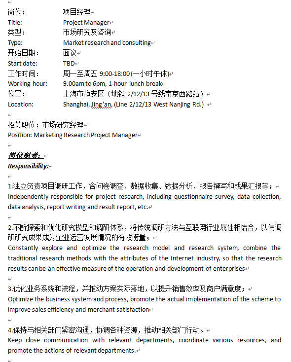 年假15天起!瑞典的咨询公司需要一个项目经理:全本,形象好,英文好,2年以上乙方市场调研公司或甲方调研岗经验,薪资15k左右,氛围非常好,南京西路上班