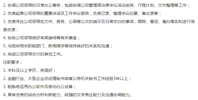 国内知名保险公司,新增董事长助理,年薪20-30万。要求是在大型国企,或政府做过,当过领导秘书之类的,全本以上,年龄不超过40岁,要男性,跳槽不要很多的。全额交金,年终14薪。4号线西藏南路上班。
