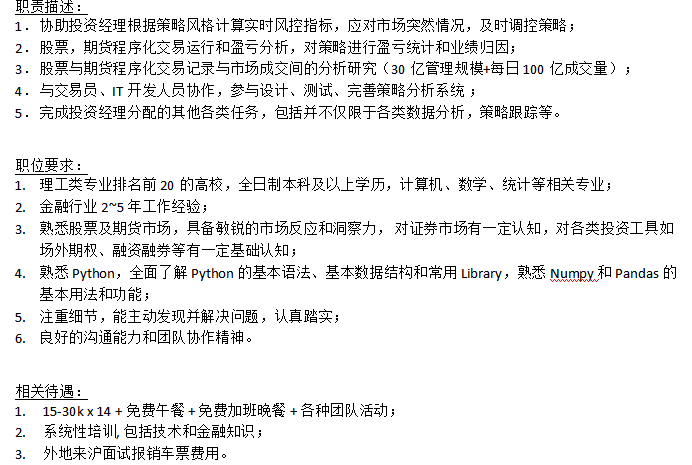 量化对冲基金公司要投资经理助理,要男生,2年以上相关经验,好学校毕业的,熟悉python,薪资15-30k,14薪,免费午餐,上班地点:4号线浦电路。