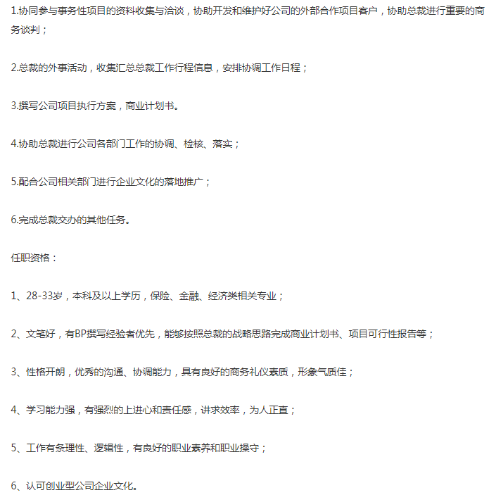 招未婚女董助,二手车供应链金融行业,要求全本,形象气质好,5年以上工作经验,2-3年董助经验,最好金融或者保险行业背景,30岁左右,能接受一些应酬和出差,薪资10-20k,9号线合川路附近