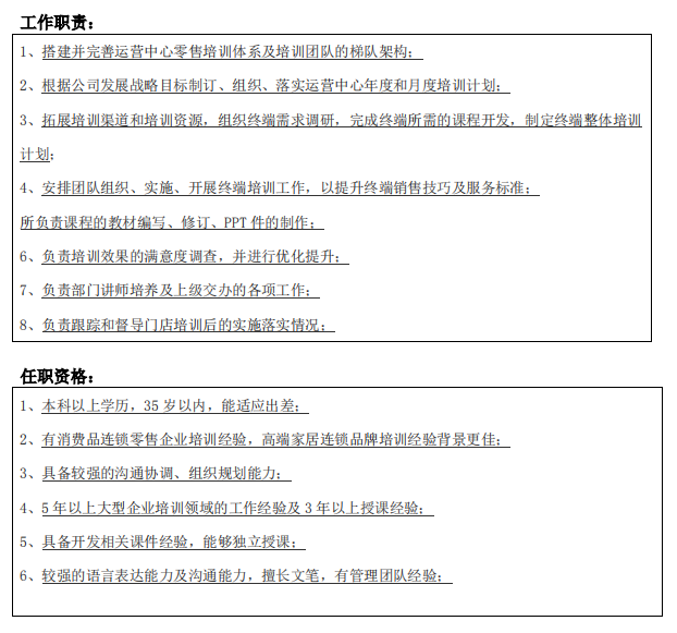 国内知名高端家居集团,要一名培训经理,大型企业培训领域经验,有消费品连锁零售企业培训经验,高端家居连锁品牌培训经验背景更佳,能够独立讲课、编写教材,薪资20K左右+五险一金+年终奖, 6/7号线高科西路上班,jd如下