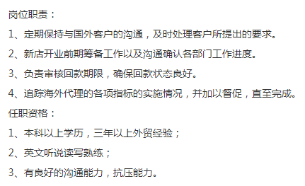 时尚休闲百货品牌,招外贸岗位,专员-主管都可以,至少要三年以上工作经验,英语流利,本科以上,薪资8-15k,年底13薪+额外bonus,9号线合川路上班。