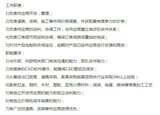 国内知名集团性公司,招一名采购,有广泛的道具、货架等供应商资源优先,熟悉五金、钢材、木材、塑胶、亚克力原材料;油漆、电镀、喷涂等表面加工工艺,需要有进出口工作经验,薪资10-15k+全额缴金+补贴700+13薪,12号线东兰路上班。