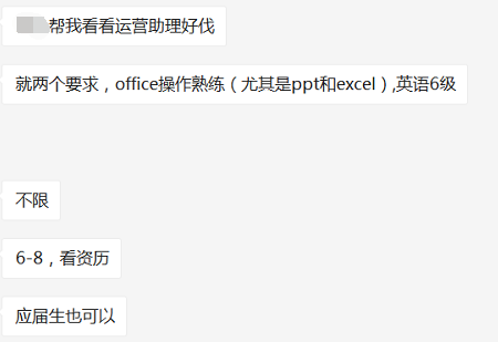 外资公司要个运营助理,应届生都行6-8k。excel熟练,英语6级以上,补充医疗,年假10天起,年底奖金1-3个月不等。4号线浦电路上班。