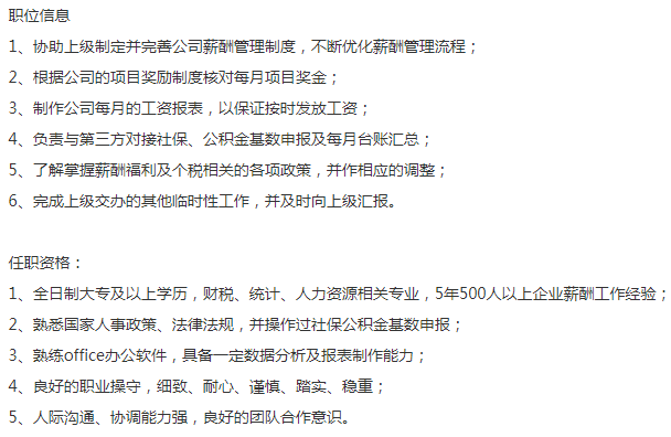 高级薪酬专员/主管