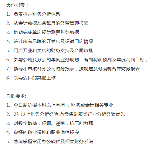 零售专业公司要财务分析,35对以内,男女不限,全本学历,之前在事务所做过零售行业的审计,或者之前做过财务分析的优先考虑,薪资8-14k,上班时间:8:30-5:30,双休,上班地点:1号线上海火车站。