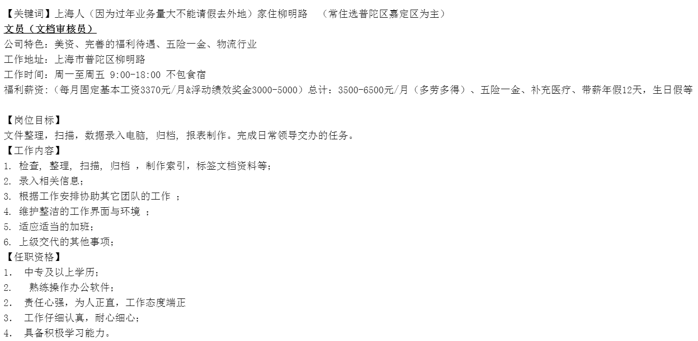美资上市公司要个文员,就是管管文件、录入数据、扫描一下就可以,上海人,就想找份工作的可以来报名,普陀区柳明路附近上班。