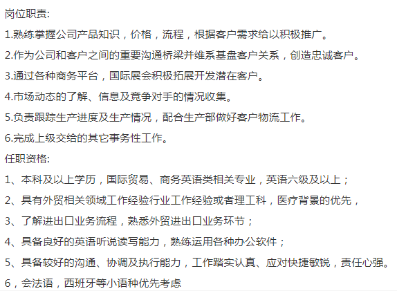 上市医疗器械公司要海外销售,要求最好是女生,19年、20年,贸易相关专业毕业,英语六级及以上,基本薪资6-10k+提成,有高温补贴,弹性上班制,双休,6号线临沂新村办公。