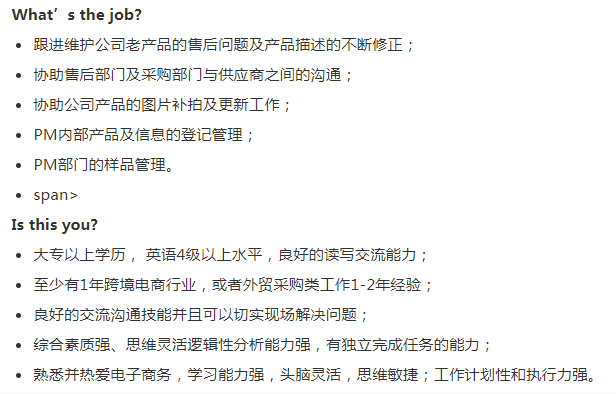 贸易公司要产品开发助理,要求男生,大专及以上学历,本科最好,应届生的话最好是采购相关专业,薪资6-7k,500全勤,朝九晚六,双休,9号线陆家浜路办公。急招!