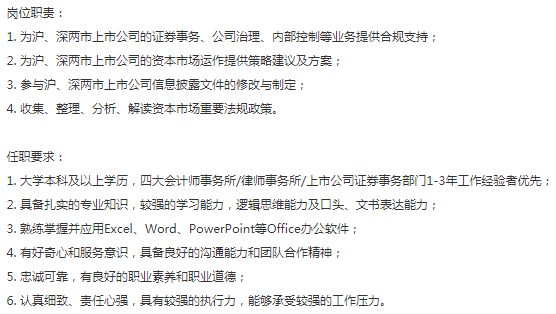咨询公司招合规咨询的岗位(信息披露方向),硬性要求:985、211及以上学历背景,四大会计师事务所,律所相关工作经验,上市公司证券事务部门1-3年工作经验者优先, 法学相关专业,男女不限 。薪资9-14k,五险一金全额,13薪+bonus,上班地点:浦东 4号线 浦电路