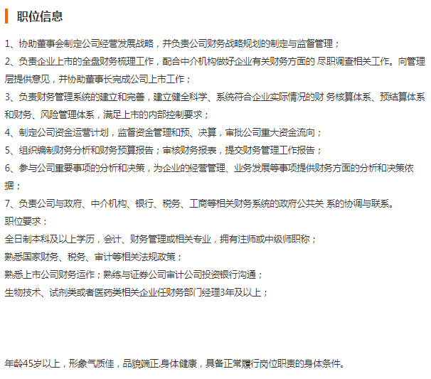 有没有财务总监要找工作的,医疗公司,薪资4-7万月薪,目前公司准备主板上市,想找个财务总监之前做过辅助公司上市这块的。对外沟通比较多