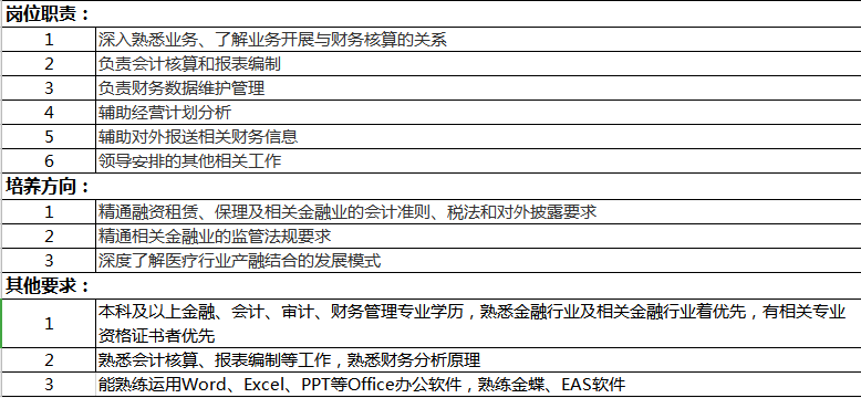 大健康产业的融资租赁公司要个财务助理,6k左右,财会专业。男生优先,地址国华人寿金融大厦