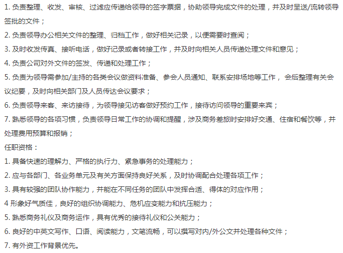 国内知名集团公司,旗下拥有多家上市公司。总部在招一位行政秘书,薪资12-15k,优秀可谈。主要是偏对内的行政工作,文字功底好些,男女不限,女生已婚已育最好。最好海归硕士,英文OK,9号线肇嘉浜路独栋大厦办公