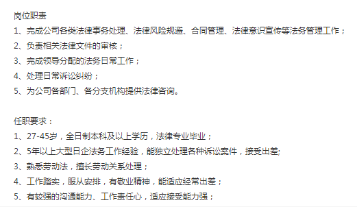 世界500强外资企业,招一名高级法务/法务主管,男士,熟悉劳动法和合同审核,必须要通过法考,有律师证优先,薪资10-15k五险一金(全额)+补充公积金+补贴+员工食堂+年终奖金,1号线共富新村上班