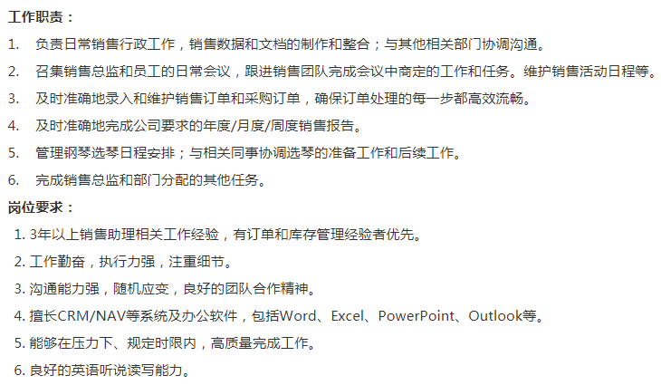 欧美外资要销售助理,最好本科学历,刚毕业1-2年,相关一点的工作经验(可放宽),英语水平高,计算机二级或者会使用vlookup函数及透视图,薪资面议,不会低于市场价,上班地点:外高桥保税区北地铁6号线