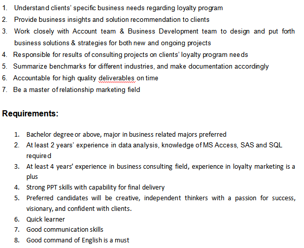 法资上市的咨询公司要一个Senior Consultant,要求全本或以上的学历,商业类相关的专业最好,有至少两年的数据分析经验,英语无障碍交流,薪资10-20k,六险一金,每月额外补贴,年底bonus,一号线,汉中路上班