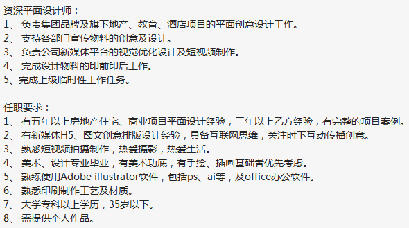 知名地产集团,要【资深平面设计,薪资15K+】,位置:1号线莘庄,JD如下