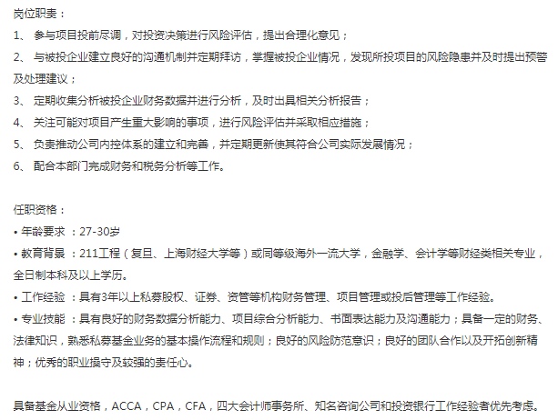 金融公司要财务经理,211及以上学历,有3年以上私募股权、证券、资管等机构财务管理、项目管理或投后管理等工作经验,薪资15-25k,一年15-16薪,办公环境高大上 ,独栋别墅,五险一金全额缴纳,9:00-17:30,双休,10号线交通大学办公