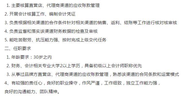 外资服装贸易公司要应收会计,最好是有消费品经验,财务相关专业,男女不限,有财务证书,朝九晚六,双休,上班地点:9号先 合川路