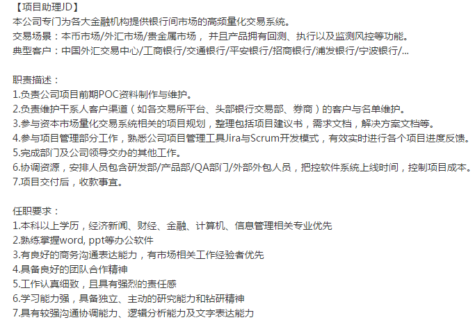 快速发展的金融量化科技公司需要【项目助理】-ToB端,主要对接:银行、券商、交易所等大型机构 。